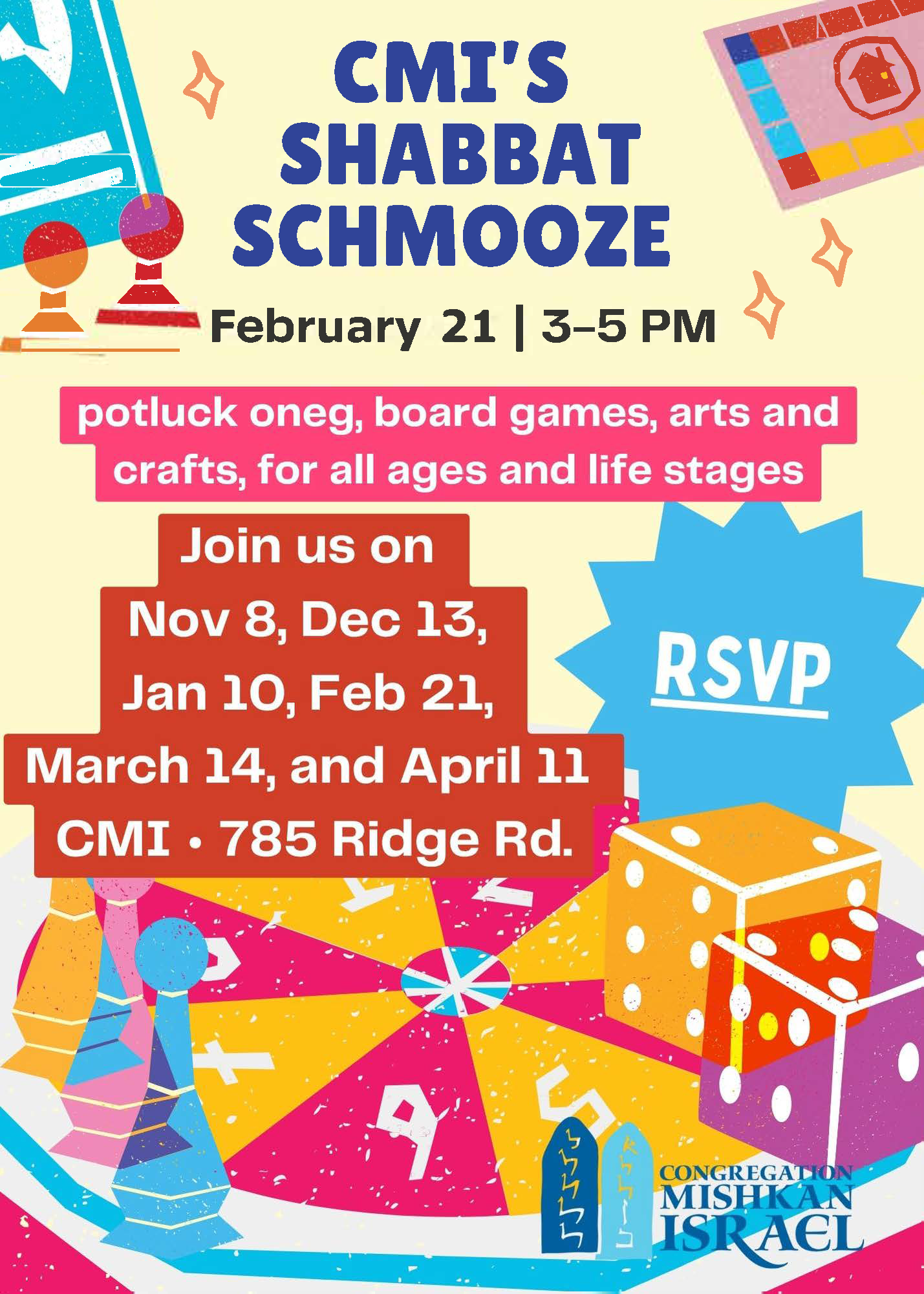Join us for a potluck oneg with games, arts & crafts, and of course plenty of space to schmooze. This event is for all ages and life stages. So, whether your game of choice is Candy Land or Mahjong, we hope to see you there! For security purposes, please RSVP.